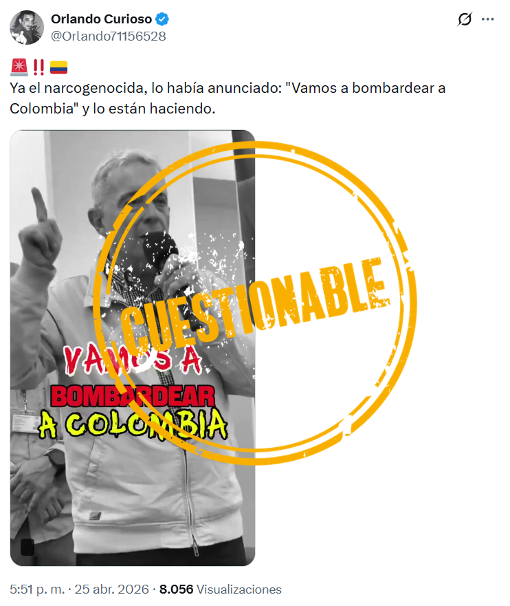 La grabación recortada comenzó a circular desde el 24 de abril, después de los atentados que se han registrado en Valle y Cauca. Las publicaciones ya acumulan más de 160.000 visualizaciones. En X, fue difundida por cuentas que en el pasado hemos chequeado por desinformar, como Orlando Curioso (@Orlando71156528) y Físico Impuro (@FisicoImpuro).