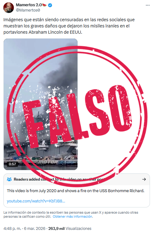 Los colegas de Maldita.es, Newtral y EFE Verifica han verificado otros videos y fotos falsas que han circulado sobre el supuesto ataque al USS Abraham Lincoln. Este circula en Colombia por cuenta de un perfil desinformador que ha difundido otras imágenes falsas para alentar una narrativa proiraní en el contexto de la guerra actual.