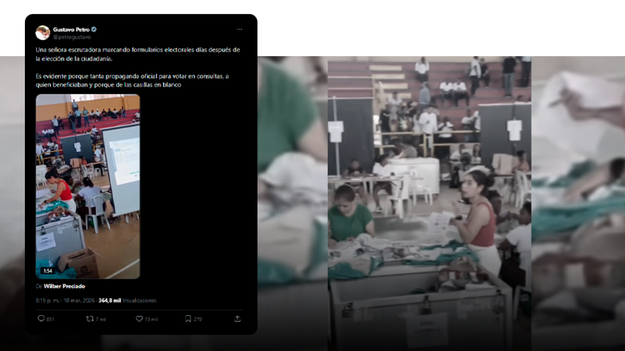Dos veces, el presidente Gustavo Petro compartió un video que muestra a una mujer escribiendo al parecer sobre tarjetones no marcados durante el escrutinio en un coliseo de Tumaco, Nariño, y sugirió que esto sería una prueba del supuesto fraude electoral que había anticipado repetidamente con base en desinformación.